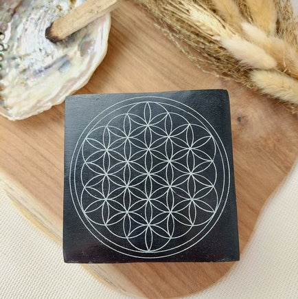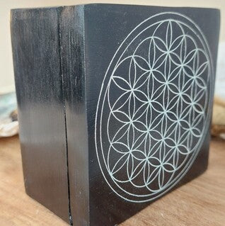 Boîte à bijoux carrée en Saponite avec une fleur de vie gravée sur le couvercle.