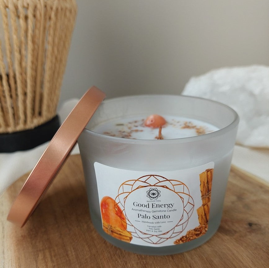 Bougie artisanale incrustée de petites pierres de cornaline et de palo santo.