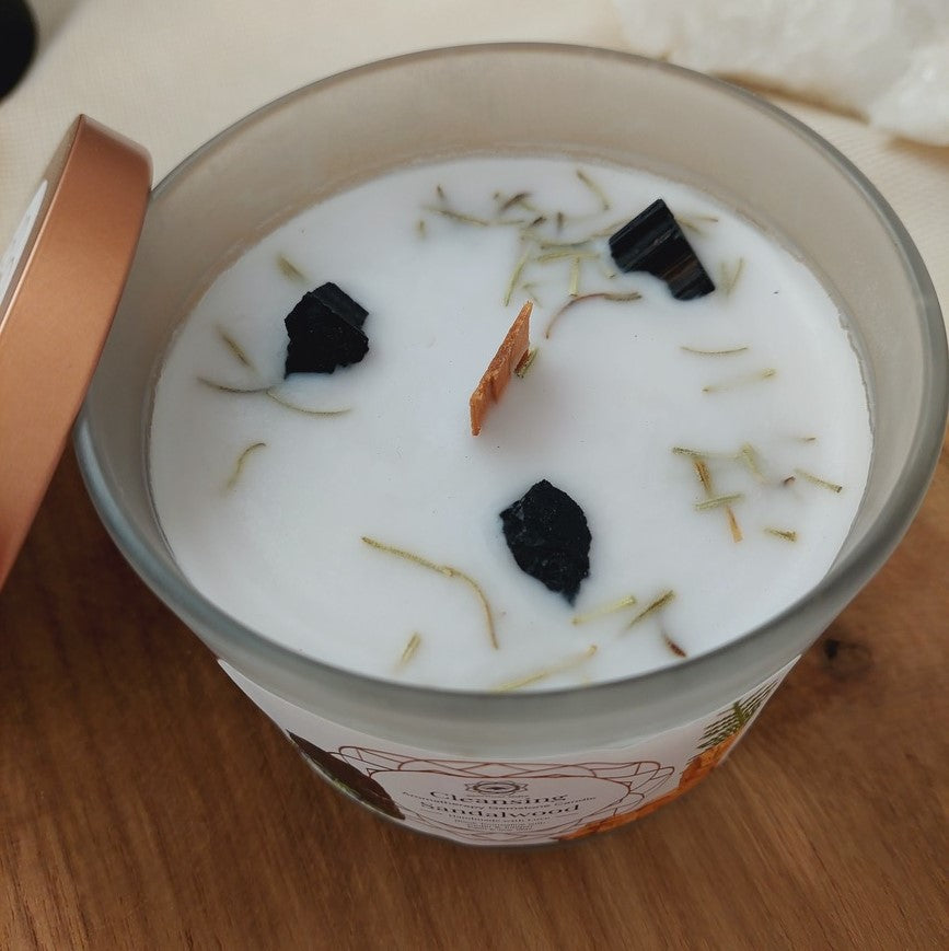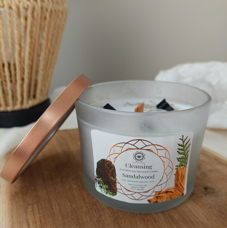 Bougie artisanale incrustée de petites pierres de tourmaline noire et de bois de santal.