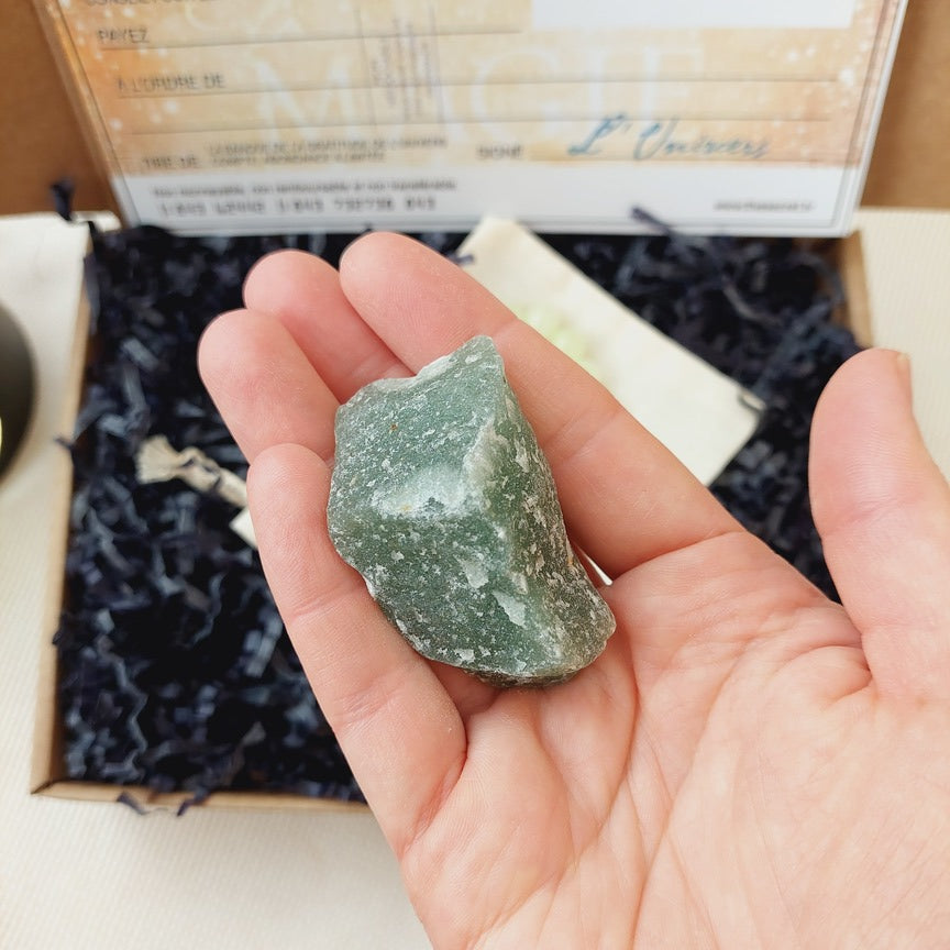 • 1 aventurine verte brute : associée à la chance, elle renforce votre capacité à saisir les opportunités et à manifester vos désirs matériels