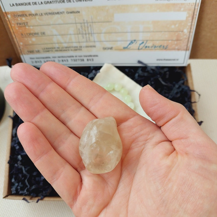 • 1 citrine roulée : stimule la confiance en soi et la détermination nécessaires pour concrétiser vos projets. Elle dissipe les blocages énergétiques liés à l'abondance et attire la chance dans les affaires.