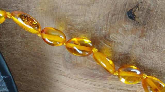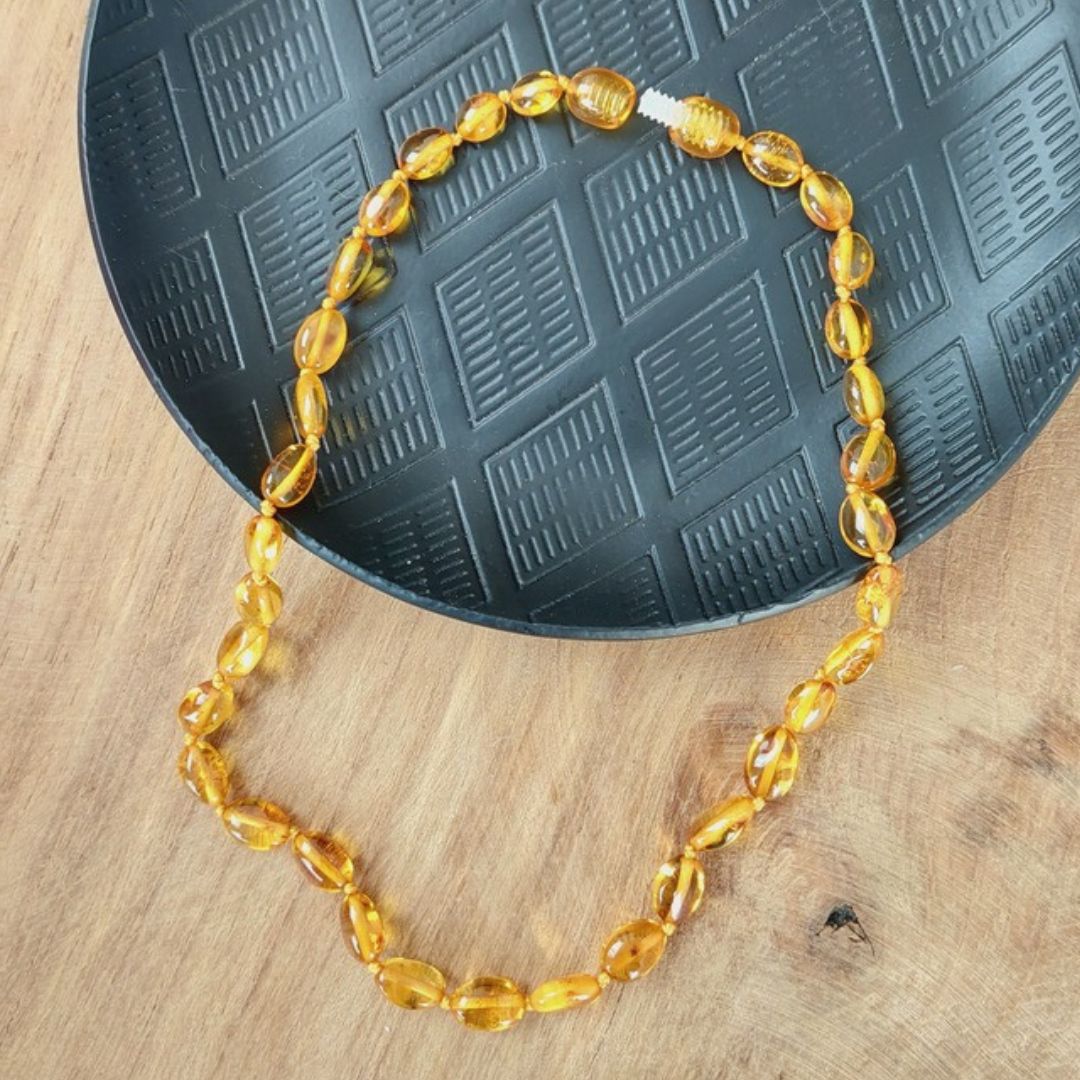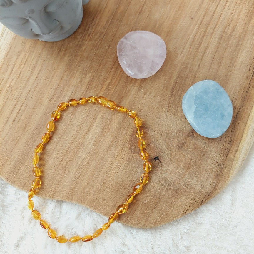• un collier d'ambre, cette résine fossilisée millénaire est reconnue depuis des générations pour ses vertus apaisantes lors des poussées dentaires. Au contact de la peau de bébé, des frictions et de la chaleur corporelle, l’ambre libère de l’acide succinique qui contribue à soulager la douleur.