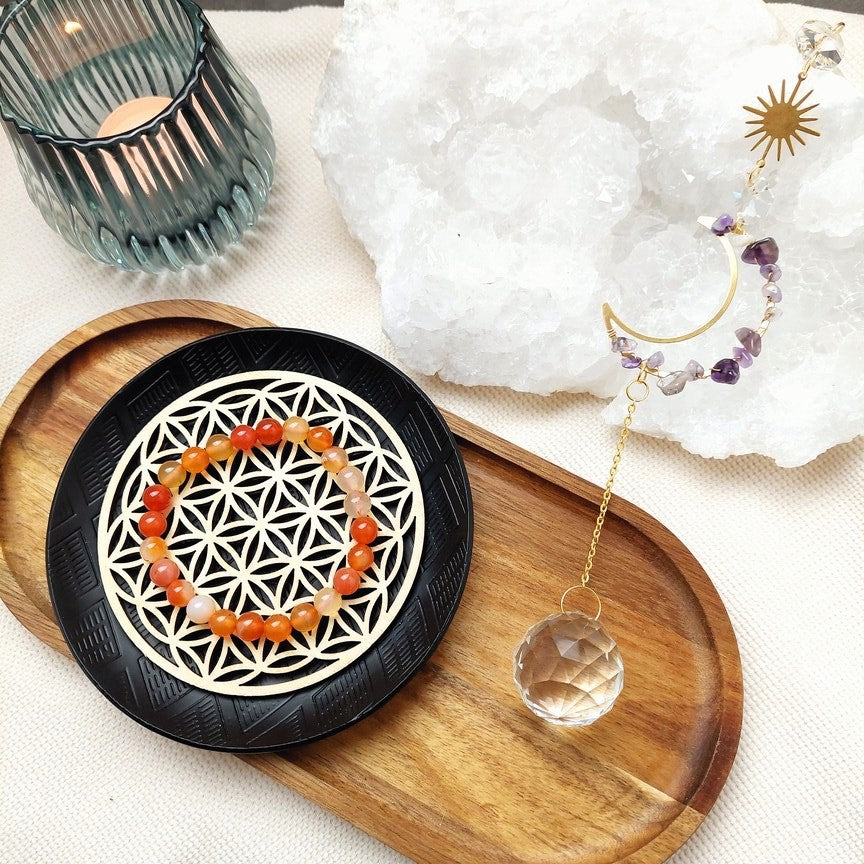 La fleur de vie est un symbole qui harmonise et équilibre les énergies grâce à sa géométrie sacré. Placer un bijou en pierre au milieu de ce motif permet de le recharger après purification.