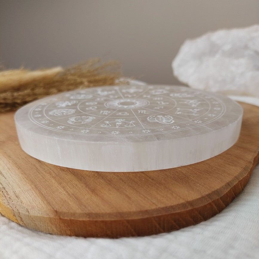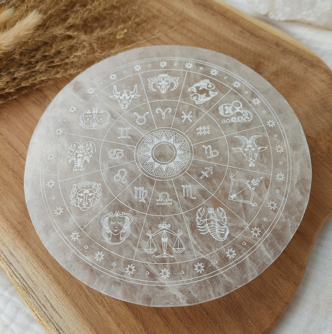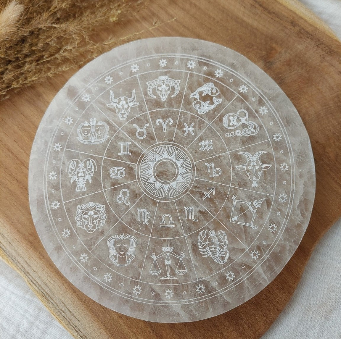 Magnifique plateau en sélénite de 14cm de diamètre fabriqué de manière artisanale gravé avec les signes du zodiaque.