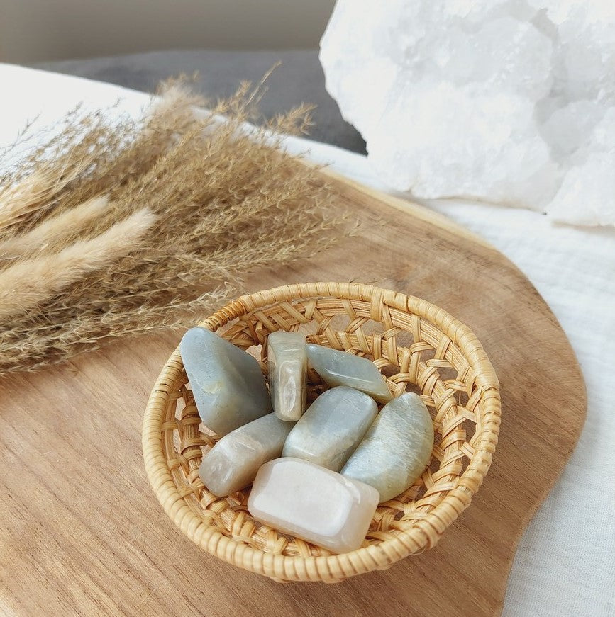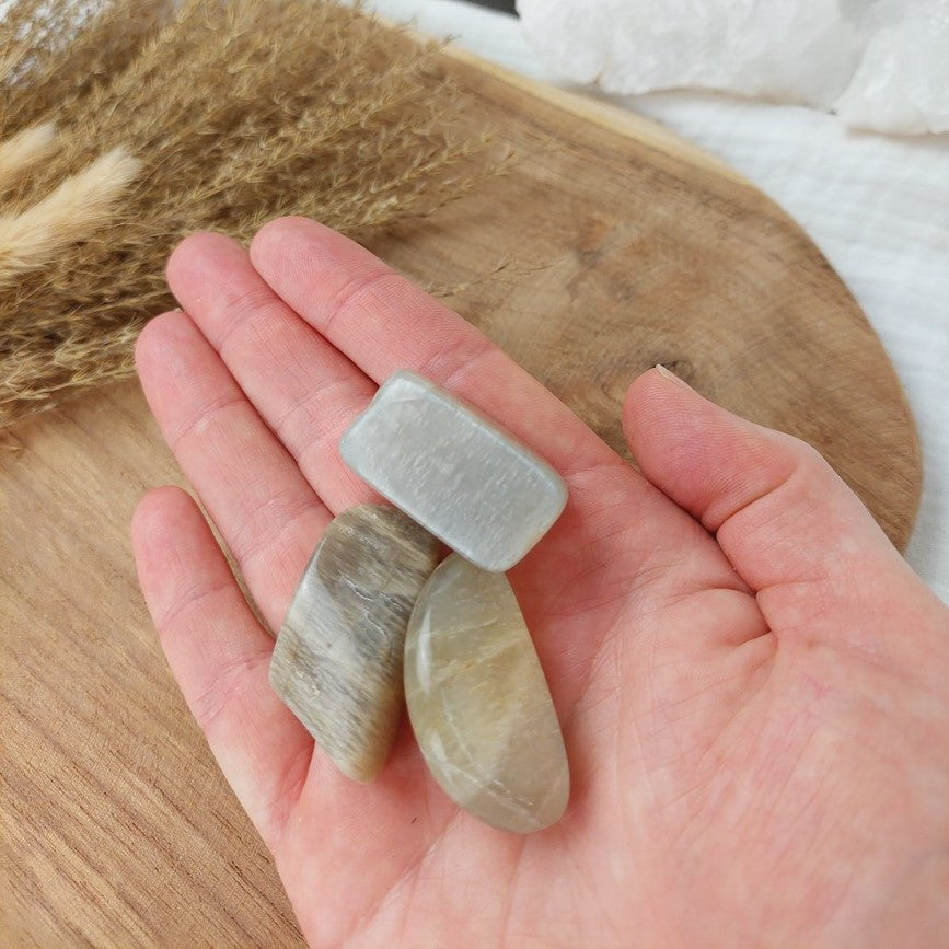La Pierre de Lune aide à atténuer le stress et l'anxiété. Elle favorise l'intuition, la sagesse féminine et est souvent utilisée pour soulager les les symptômes menstruels. Elle est un symbole de nouveaux départs, d'espoir et de croissance personnelle